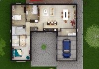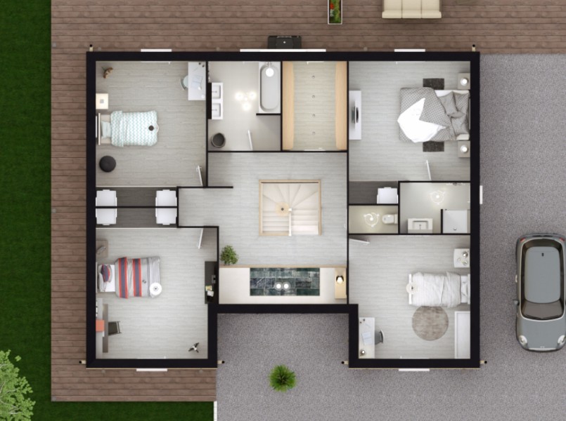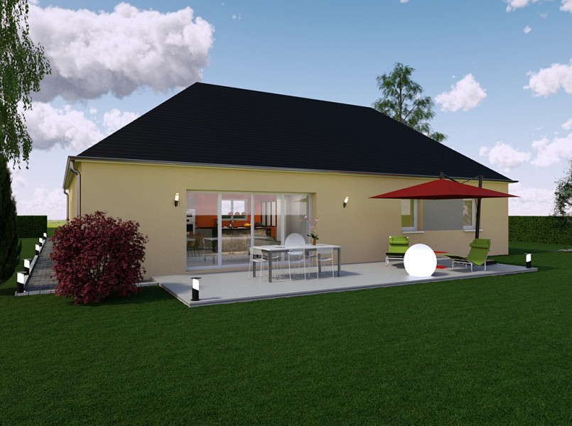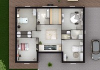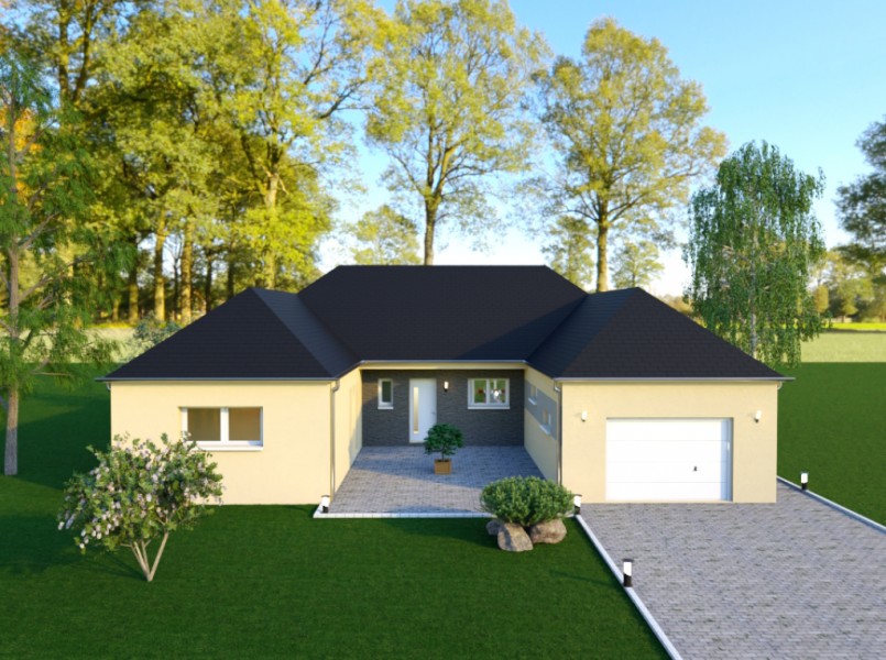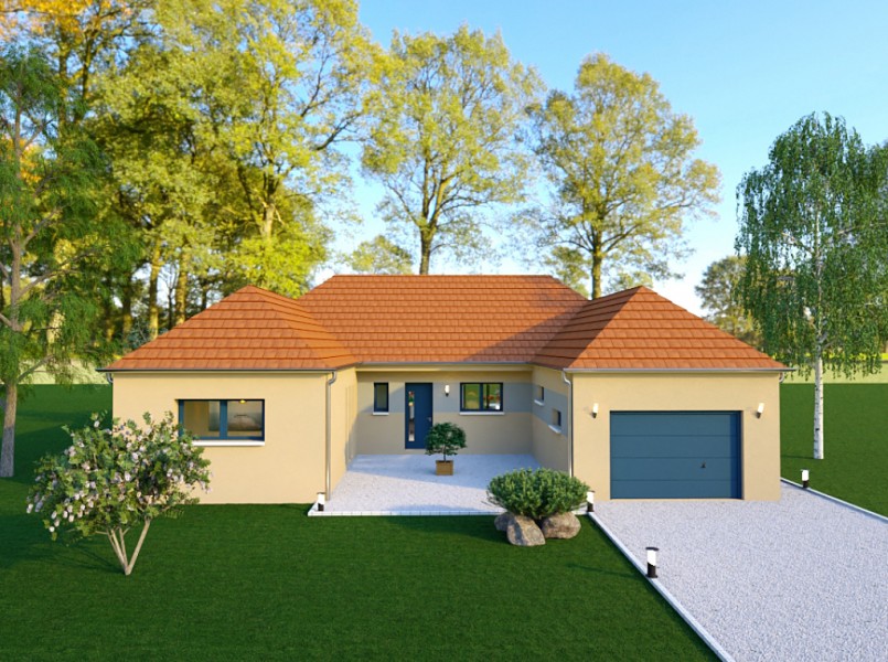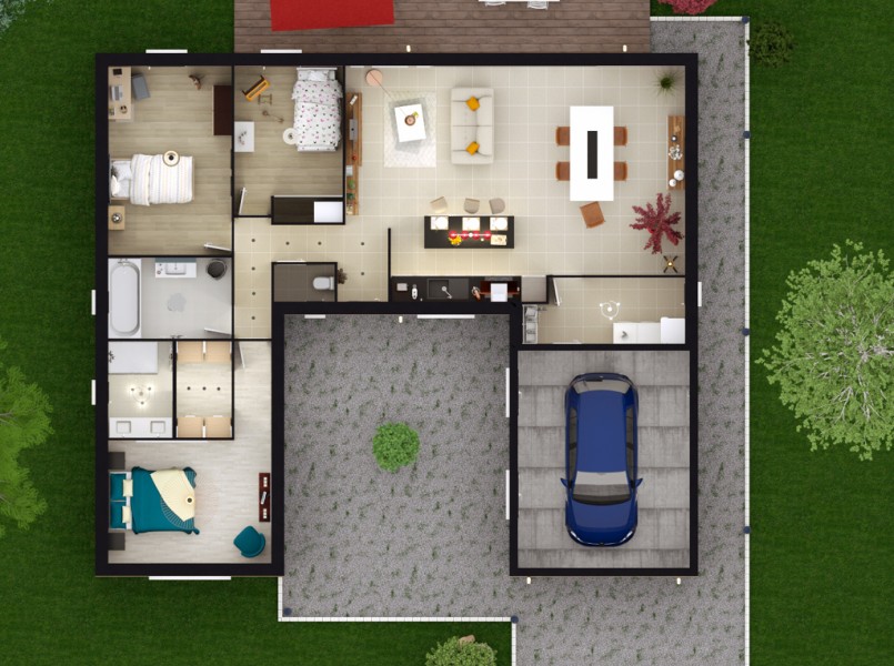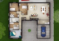 Une conception en U et beaucoup d’originalité pour cette maison de plain-pied qui s’enroule autour d’un jardin intérieur. Les plans de cette maison individuelle sont constitués de trois blocs perpendiculaires et donnent une place centrale à la pièce de vie de 46 m². Vous noterez les dimensions inhabituelles de la baie vitrée coulissante, 4 mètres d’envergure, pour profiter des extérieurs été comme hiver. L’aile gauche de la maison est réservée aux chambres dont une vaste suite parentale qui dispose, entre autres, d’une entrée percée par un alignement élégant de 3 fenêtres étroites. L’aile droite de la maison inclut le garage facilement transformable en atelier, d’autant que les plans prévoient d’emblée deux fenêtres horizontales. Ce plan de maison en U se décline de 108 à 126 m² avec 3 ou 4 chambres, tous les intermédiaires sont également envisageables.