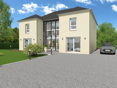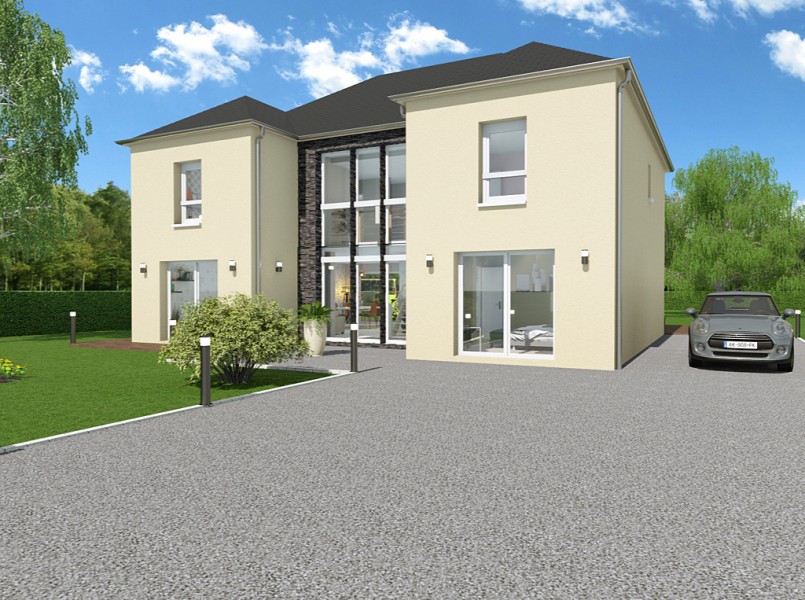 Voici la plus vaste des maisons Lelièvre, plus de 208 m² habitables. Vous ne risquez pas de vous sentir à l’étroit, ni de manquer de manquer de lumière au vu du mur vitré qui occupe près d’un tiers de la façade avant, et ce sur les 2 niveaux de la maison. La pièce de vie, qui inclut l’espace cuisine dans sa continuité, cumule à elle seule près de 75. m². Cette pièce bénéficie d’un magnifique éclairage naturel, profitant largement de l’apport lumineux de la grande baie vitrée qui court sur les 2 étages de la maison. Cette maison comprend cinq grandes chambres, dont une suite au RDC, incluant un dressing et une salle de bains privative. À noter également, la présence de 2 salles-de-bain à l’étage pour desservir les 4 chambres. Sur ce modèle de maison à étage, les chambres ne sont pas mansardées, la surface au sol est la même qu’au plafond. Les plans prévoient des espaces généreux, en moyenne 16 m² et souvent plus, pour les chambres.