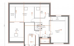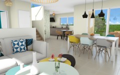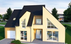 Ce plan de maison contemporaine, loin des parallélépipèdes qui caractérisent souvent les maisons modernes, fait preuve d’une forte personnalité architecturale et ose les ruptures géométriques. Trapèzes et formes triangulaires imbriquées créent une façade atypique, les espaces de vie à intérieur se dessinent avec la même intensité. Cette maison contemporaine aux combles entièrement aménagés affiche quasiment 140 m² habitables, dont une grande pièce de vie qui épouse la forme d’un W et dont les murs sont équipés de 3 grandes baies vitrées coulissantes. Le plan prévoit également 2 belles suites parentales, celle de l’étage se déploie sur près de 30 m². Le pallier du deuxième niveau s’ouvre sur un balcon maçonné.