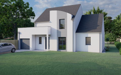 Plus de 124 m² habitables et un plan de maison optimisé. Aucune place n’est perdue, l’escalier est judicieusement pensé pour ne pas empiéter sur la grande pièce de vie. Les espaces nuits sont bien séparés pour le confort de tous les occupants. Une très belle suite parentale au rez-de-chaussée dans l’aile droite et 3 chambres à l’étage. Plancher béton, bien-sûr, pour l’étage comme pour le rez-de-chaussée. Côté architecture, la maison Calluna ne manque pas d’audace, les niveaux multiples de sa toiture se combinent harmonieusement avec la courbe de sa façade et le porche à toit plat qui prolonge le garage.