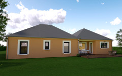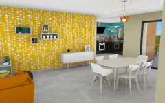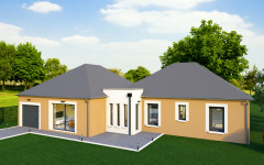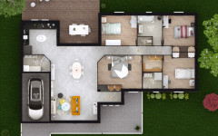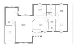 Le plan de cette maison de plain-pied témoigne tout à la fois d’une conception architecturale originale et d’un véritable sens pratique. Deux modules architecturaux, chacun couvert d’une toiture 4 pentes, font visuellement jonction dans un troisième espace à toit plat, le sas de l’entrée. Habillé par trois fenêtres aussi étroites qu’élancées, le sas de l’entrée s’invente une forte personnalité. L’aile gauche de la maison est réservée à la pièce de vie qui se prolonge sur une cuisine semi-ouverte, au total près de 49 m² pour vivre en commun ! Ces deux pièces s’enroulent autour d’un espace extérieur couvert d’environ 10 m², à investir comme un véritable jardin d’hiver abrité du vent ou une terrasse protégée des intempéries. L’aile droite de la maison, desservie par un couloir central, est dédiée aux 4 chambres, dont une grande suite parentale équipée d’un dressing et d’une salle d’eau, eux-mêmes clos par des portes à galandages pour éviter toute contrainte dans la disposition de votre mobilier.