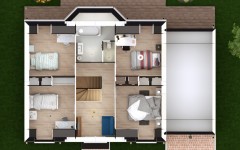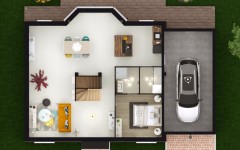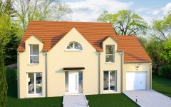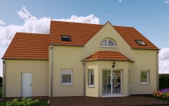 Cette maison neuve de style tradition joue la symétrie avec élégance, son pignon central est flanqué de 2 baies vitrées, elles-mêmes surmontées de deux fenêtres de toit jumelles et à fronton triangulaire. Deux ouvertures en demi-lune, une côté jardin et l’autre côté cour, s’inscrivent dans la même logique symétrique de l’architecture. Un bow-window, largement ouvert sur le jardin et idéal pour les amoureux des plantes vertes, vient apporter un charme particulier à la pièce de vie principale. Les dimensions de l’espace de vie sont généreuses, 54 m² au total, s’y ajoute un cellier attenant pour les rangements et une chambre disposant d’une salle de bain privative. Notez que l’escalier qui dessert l’étage de la maison dissimule habillement les WC du rez-de-chaussée. À l’étage quatre chambres et un pallier qui pourra servir d’espace multimédia. Des combles aménageables, tout de suite ou plus tard, surplombent le garage accolé. De quoi imaginer à terme une chambre supplémentaire, un espace de stockage ou, pourquoi pas, un petit studio indépendant. C’est vous bien-sûr qui choisissez les teintes des enduits, les matériaux de la couverture et même le style de votre escalier, les plans sont également entièrement modifiables.