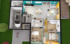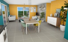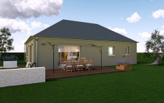 La toiture à quatre pans donne à cette maison neuve une allure résolument moderne. Son porche s’insère parfaitement dans la structure en L de son architecture. La pièce de vie, prolongée d’un espace cuisine en retrait, jouit d’une double exposition à la lumière via deux vastes portes-fenêtres coulissantes. Comme tous nos plans de maison en L, l’espace est conçu pour préserver la tranquillité de chacun en séparant de manière pertinente les espaces nuit des espaces jours, sans pour autant perdre la moindre place. Ce modèle de maison individuelle se décline, selon le même principe d’aménagement, en différentes surfaces, de 90 à 117 m², 3 ou 4 chambres et même avec suite parentale incluant une salle-de-bain privative et dressing.