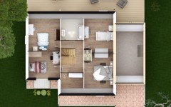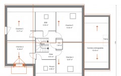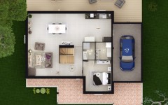 Caractérisé par son porche très dessiné, en retrait de la façade principale, et un balcon qui participe avec justesse à l’équilibre de l’architecture, ce plan de maison fait la part belle à la pièce de vie en rez-de-chaussée. L’escalier qui mène aux combles aménagés, et abrite dans le même temps les WC, est orienté de manière à éviter toute contrainte dans l’installation votre mobilier. Dans sa version 4 chambres, la maison Veronica dispose d’une très belle chambre constituée en suite à l’étage : près de 25 m² incluant dressing et salle de bain privative, de quoi imaginer un espace quasi indépendant pour des enfants qui poursuivent leurs études au domicile familial. La chambre du rez-de-chaussée, qui dispose également de sa propre salle-de-bain, est aisément convertissable en bureau. Plus de 15 m² de combles aménageables surplombent le garage et vous permettent d’agrandir, à plus ou moins brève échéance, vos espaces de vie.
